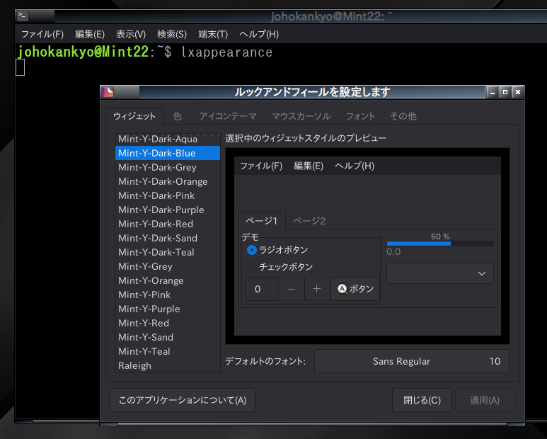 ターミナルで lxappearance と入力して起動します。 ここで「Widget」や「Icon Theme」を設定しないと、フォルダやブラウザの見た目がWindows 95のように古臭くなってしまいます。Linux Mint標準の「Mint-Y」などを選ぶと綺麗になります。