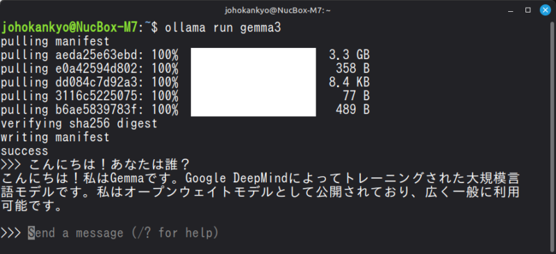 以上により、ミニPCという小さな箱の中でAIが動作し、インターネットがなくてもターミナルの中で動作する「ローカルAI環境」を手に入れることができました。