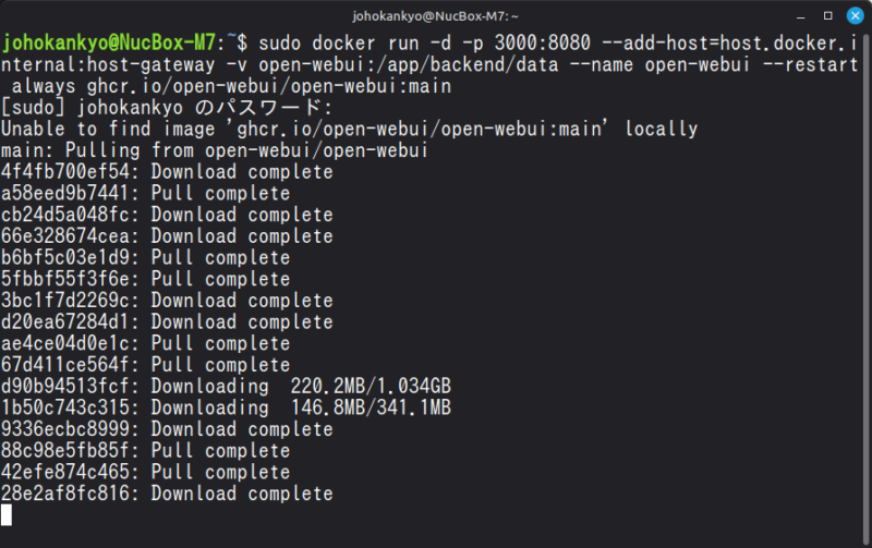 長いのですが、下記コマンドをターミナル上で実行することで、Dockerコンテナを立ち上げて、Ollamaと連携させることができます。