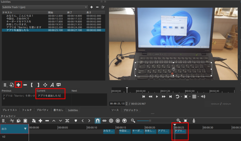 文字を入れたい場所に再生ヘッドをずらして、字幕入力欄の「+」をクリックし、「Current」のところに文字を入力していきます。