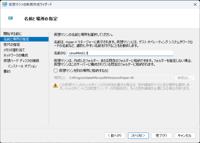 名前と場所: 「LinuxMint22.3」など好きな名前を付けます。