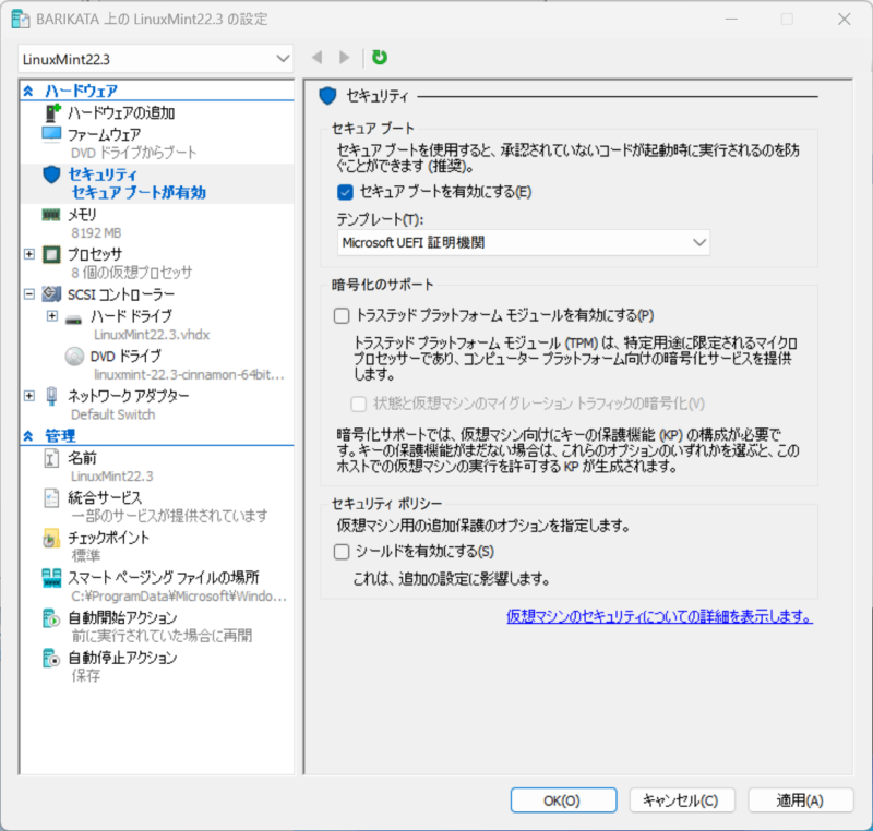 セキュアブートの設定(これをしておかないと起動エラーになります)