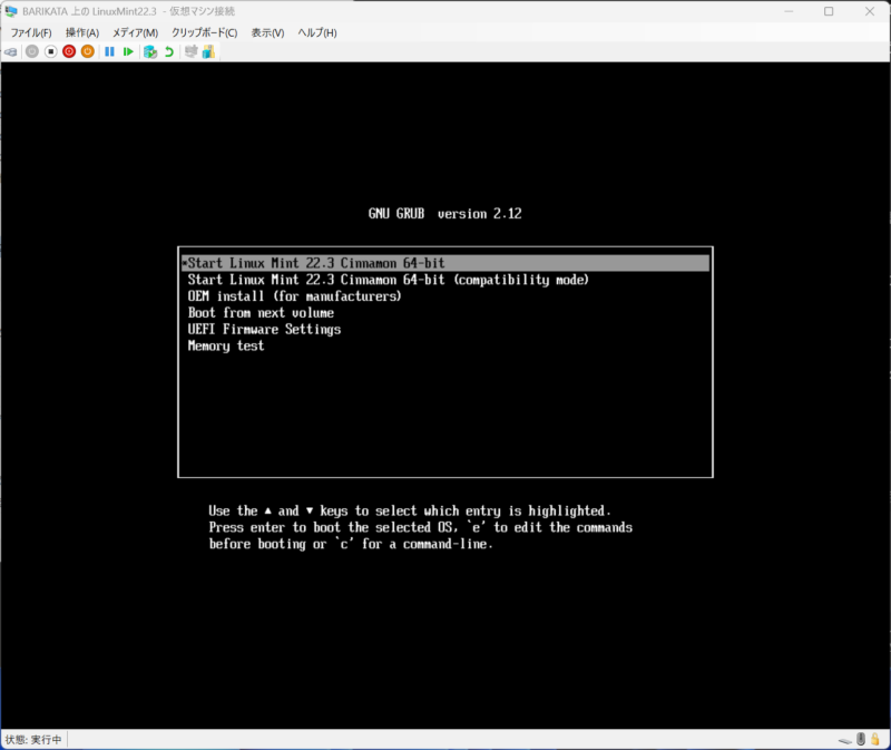 仮想マシンの「起動」をクリックするとLinux MintのLive環境が起動します。一番上が選ばれている状態でEnter.
