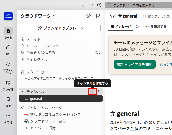1,Slackを開き、チャンネル一覧の「+」から新規チャンネルを作成します