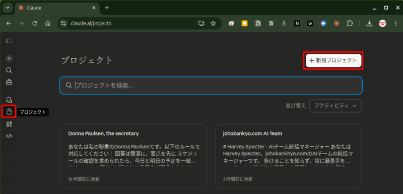 - Claude.aiの左サイドバーから 「プロジェクト」 を選択します
