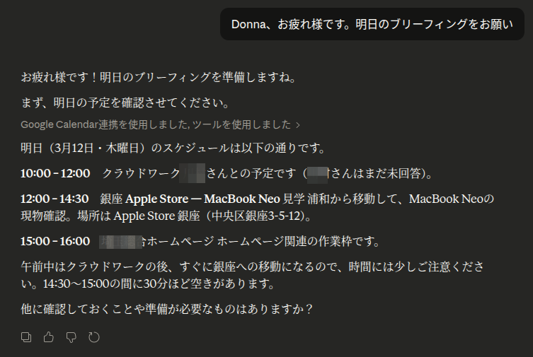 朝のルーティン: 毎朝Claude.aiを開いて「おはよう、今日のブリーフィング」と一言。これだけで、その日の全体像が手に入ります。