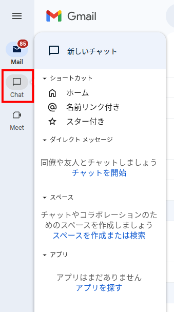 そこで活躍するのが Google Chat です。Gmailと同じ画面の左側に表示されていて、クリックひとつでチャット画面に切り替わります。LINEのような感覚でメッセージを送れるので、「ちょっと聞きたいだけ」という社内のやりとりにぴったりです。