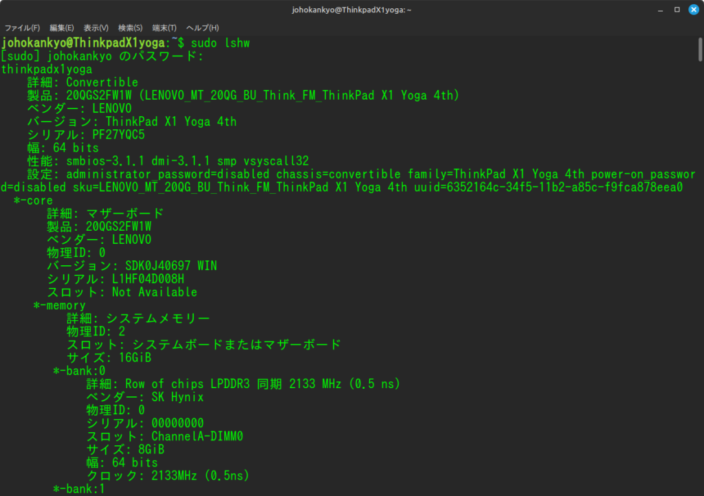 端末を起動し「sudo lshw」と入力してEnter。