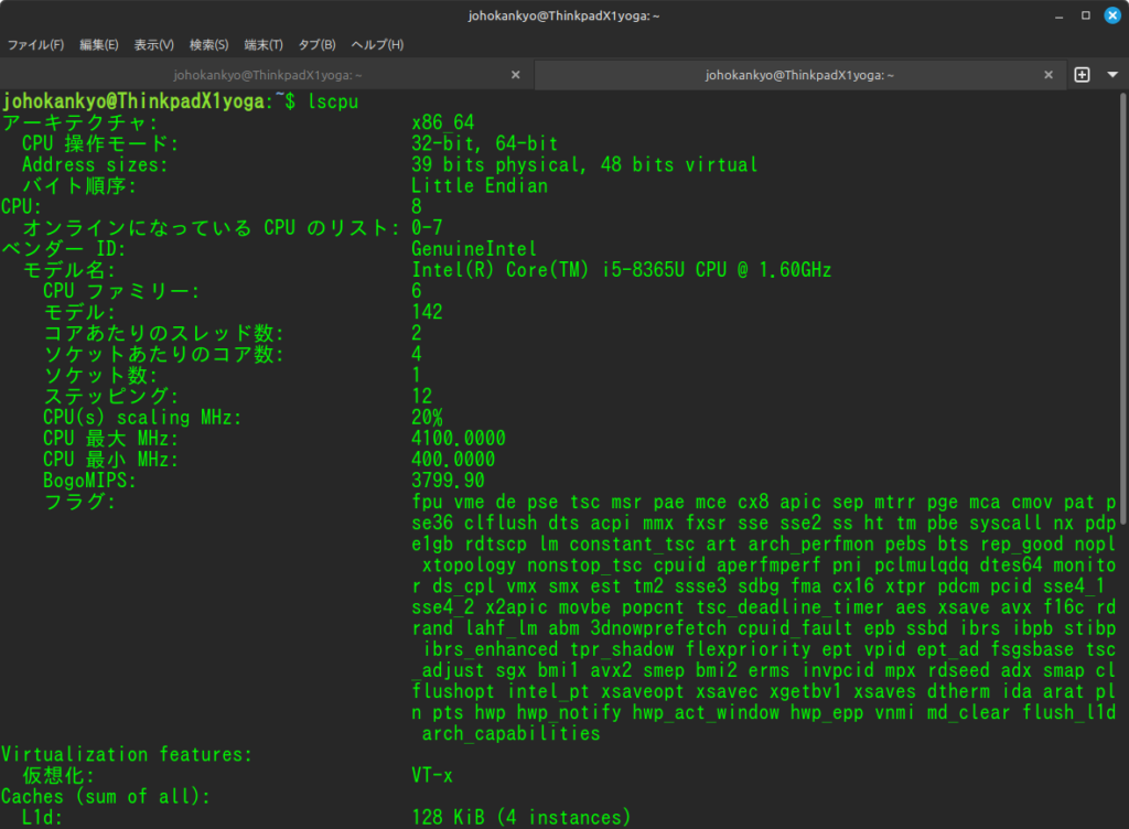 端末で「lscpu」と入力してEnter。