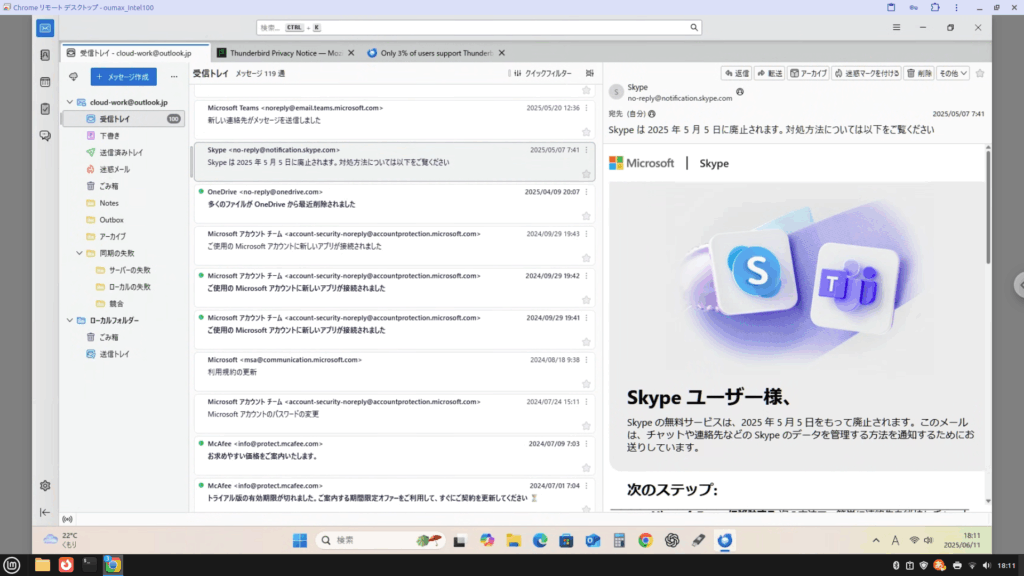 Outlookでメールの送受信ができない状態の時の代替としてオススメなのがThunderbird。Mozilla(Firefoxの開発元)が提供する無料・オープンソースのメールクライアントです。Windows・macOS・Linuxに対応し、長年にわたり安定した評価を受けており、安心して利用できます。