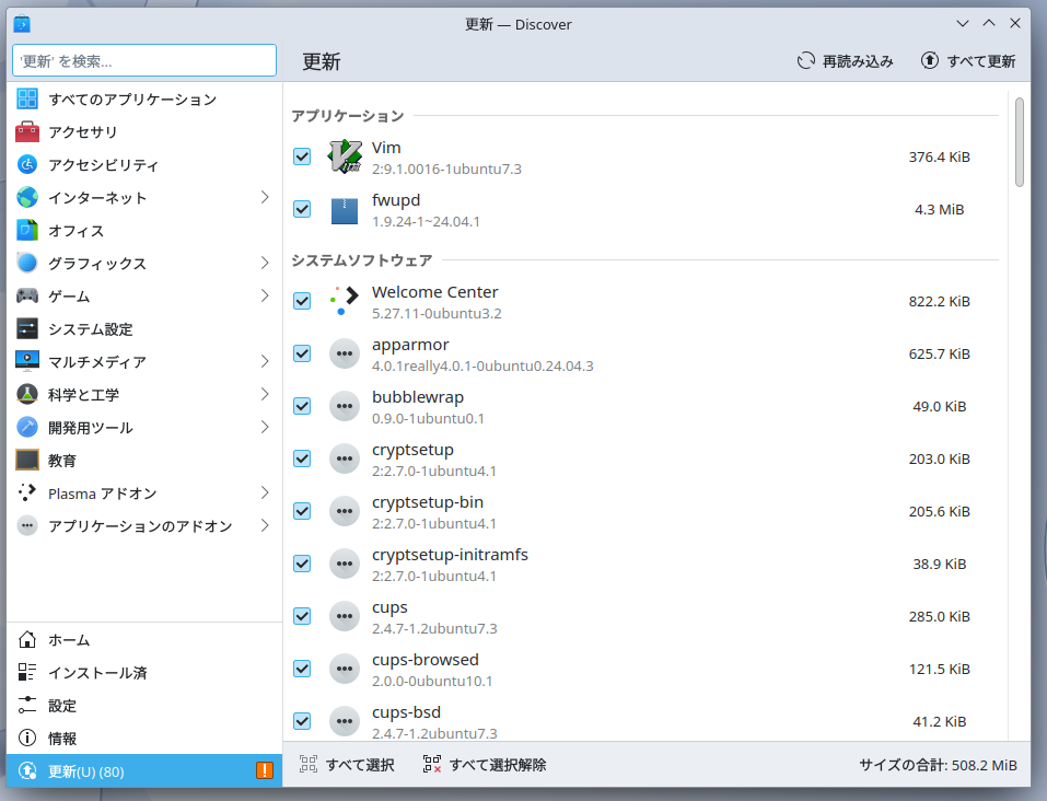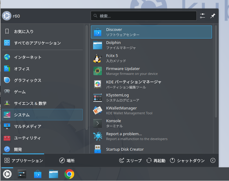 スタートメニューから「システム」>「Discover」を起動。