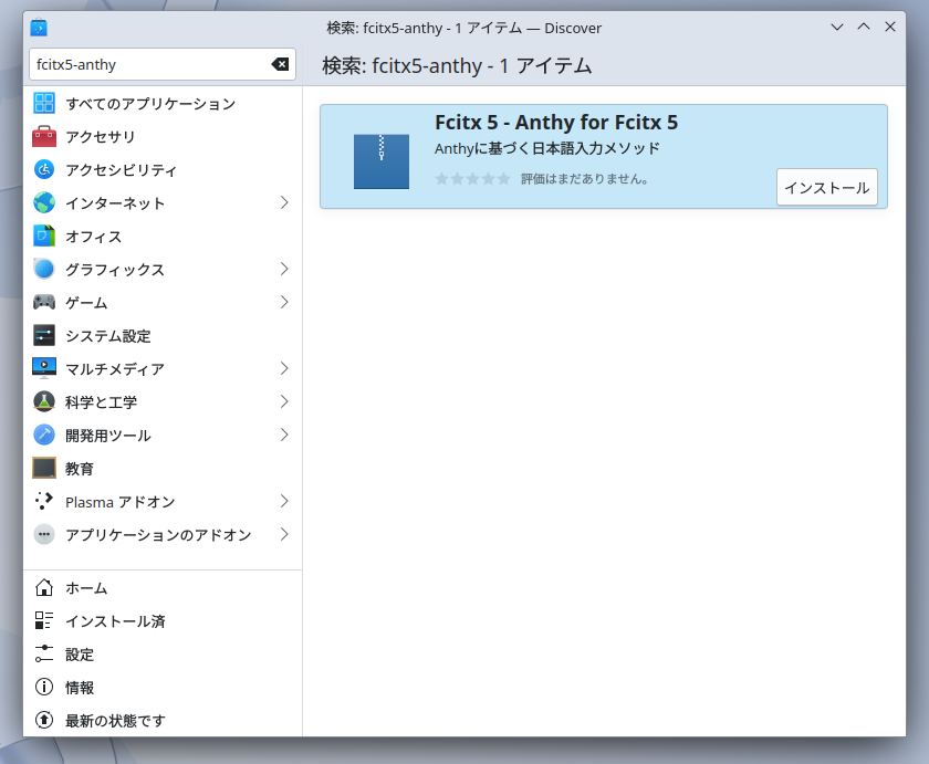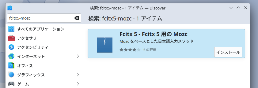 検索ボックスで「fcitx5-anthy」で検索。「インストール」します。続けて「fcitx5-mozc」も「インストール」します。