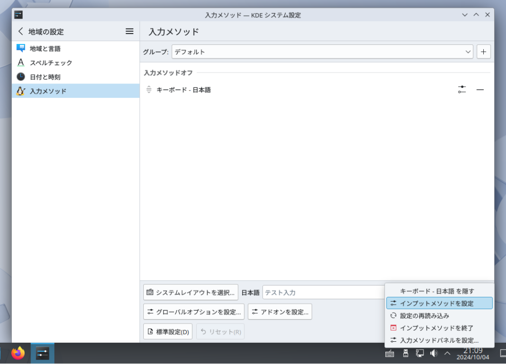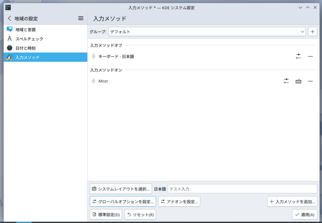端末:Konsoleでコマンドであれば、「sudo apt update」と入力してEnterしてソフトウェアリストのアップデートをした上で、「sudo apt install fcitx5-anthy fcitx5-mozc」+Enterで、一発でインストールができます。