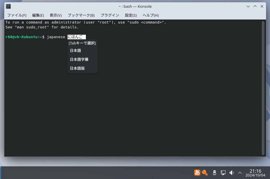 今回試してみたのはKubuntu 24.04。VirtualBoxによる仮想PC上です。ホストPCはLinuxMint22 Cinnamonです。
