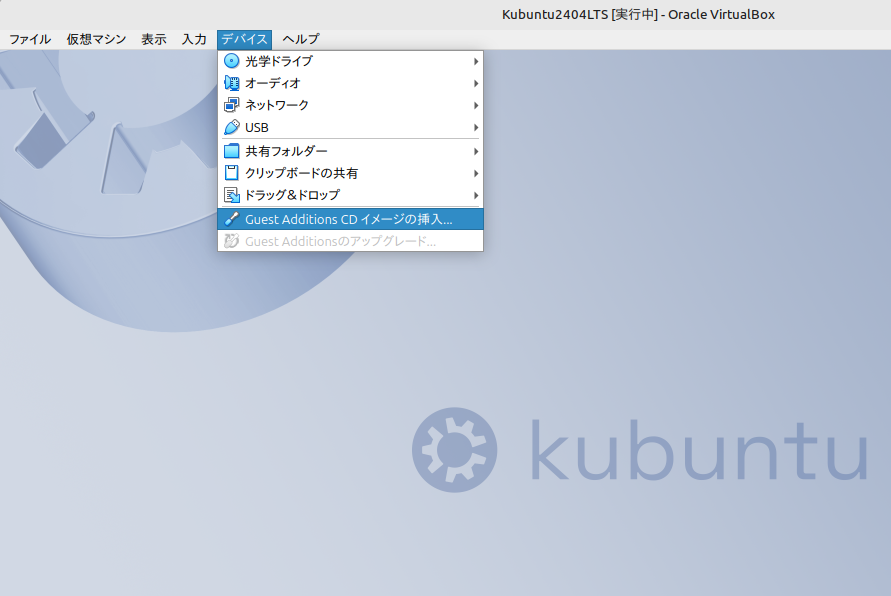 LinuxMint CinnamonであればGuest Additionsのインストールはカンタンなのですが、Kubuntuの場合、Ubuntu同様にコマンドでのインストールが必要です。