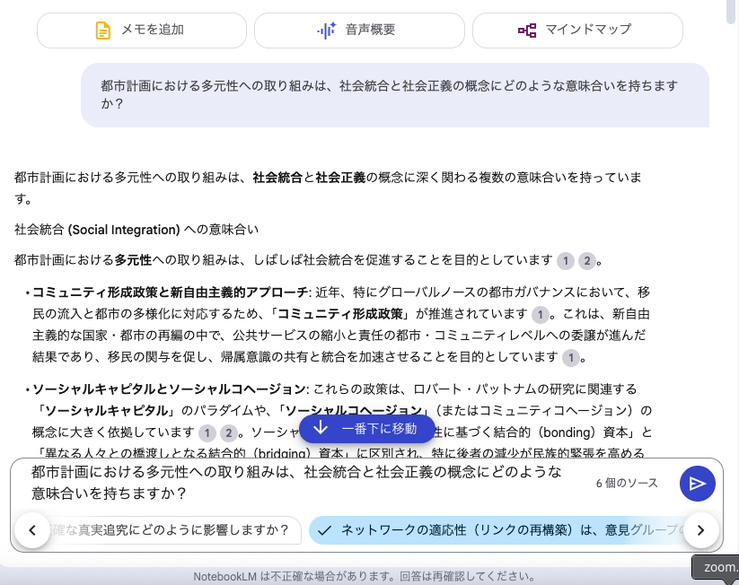 - 出典の明記: AIのすべての回答には、ソースのどの部分を参照したかを示す引用番号が付きます。