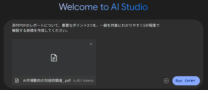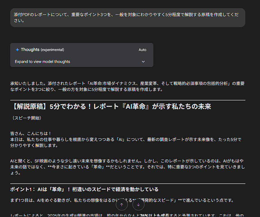 そしてプロンプト欄に「添付PDFのレポートについて、重要なポイント3つを、一般を対象にわかりやすく5分程度で解説する原稿を作成してください」と指示してみます。