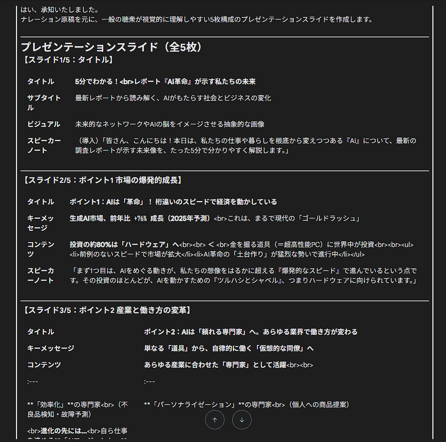 続けて、「このナレーション原稿を元に、プレゼン用のスライドを5枚作成してください」と指示します。