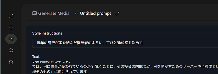 2,感情を込める: 「Style instructions」欄に「長年の研究が実を結んだ開発者のように、喜びと達成感を込めて」など、具体的な演技指導を書き込むと、表現が格段に豊かになります。