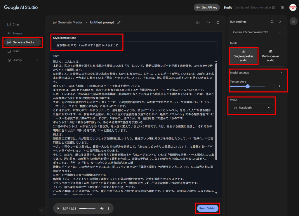 この台本を使ってナレーションの音声ファイルをGoogle AI Studioに生成してもらいます。