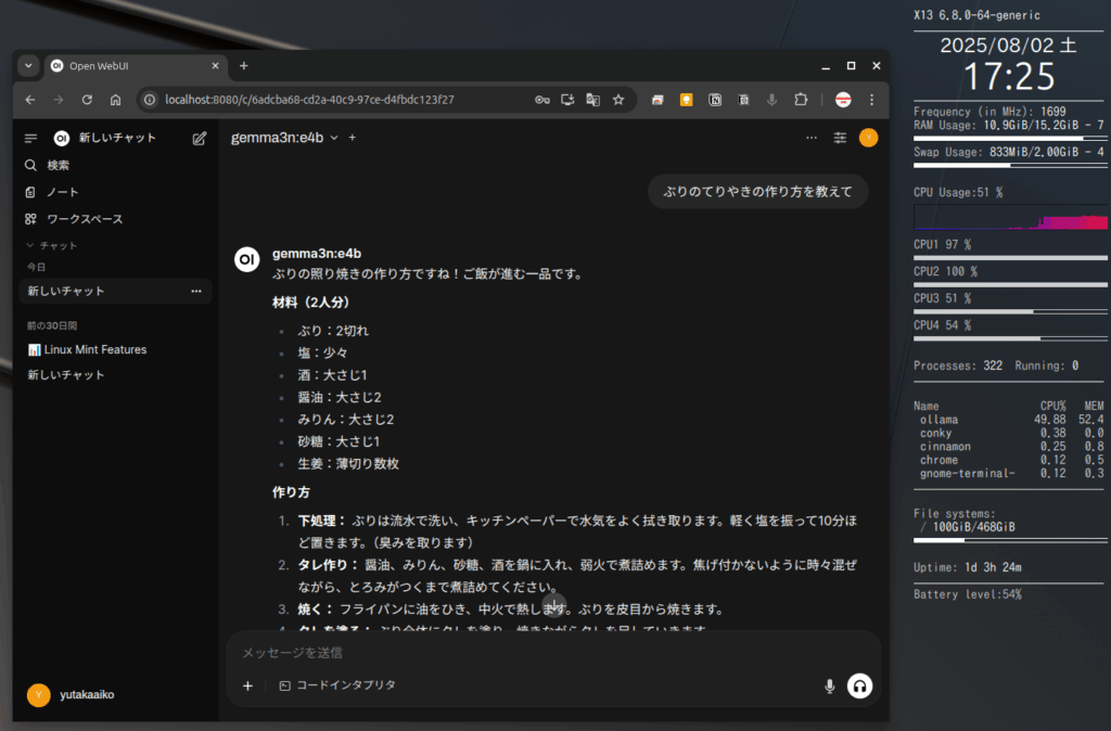 今回の例の場合、このアドレスに「:8080」をつけて、他のデバイスのWebブラウザーで”192.168.0.72:8080”とすることで、他の機器からアクセスしてローカルAIを利用することができます。