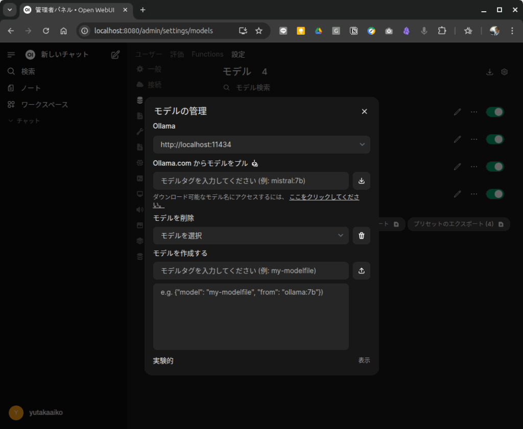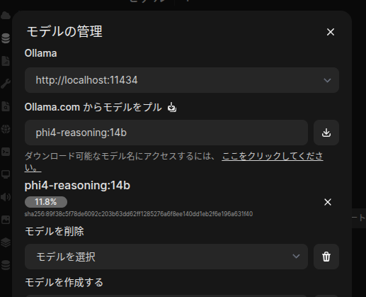このOpen WebUIの画面からもAIモデルのダウンロード(Pull)ができます。