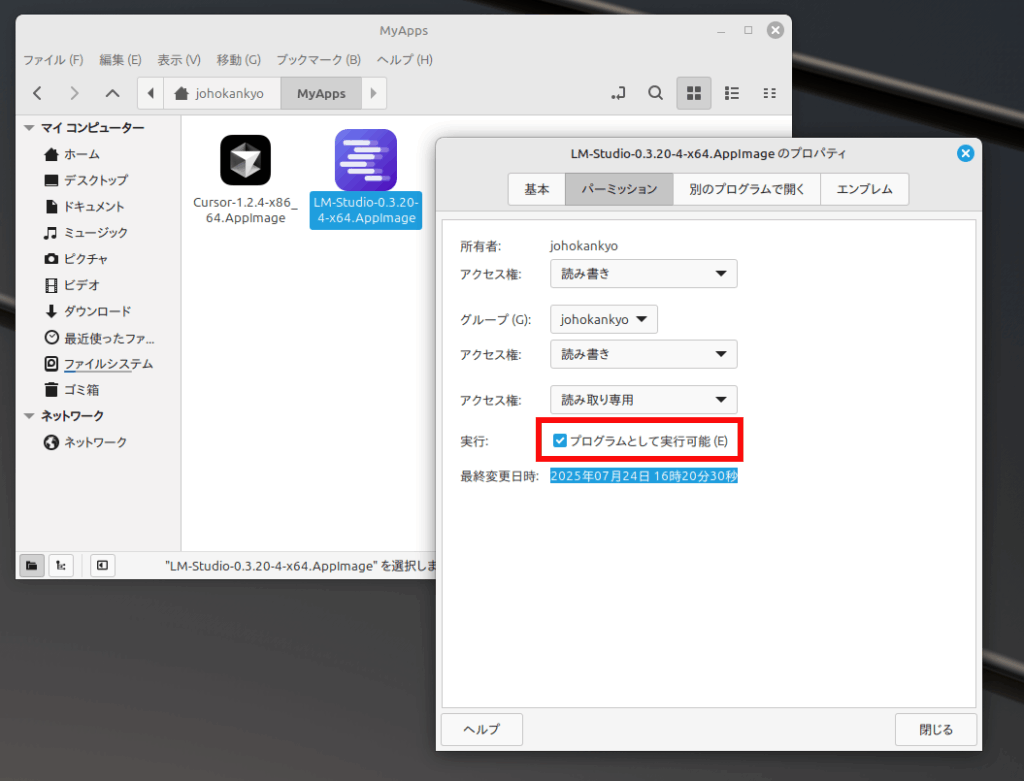 LM-Studio-x.xx.x-x86_64.AppImage)がある場所へ移動します。 - ファイルを右クリックし、「プロパティ」を選択します。
