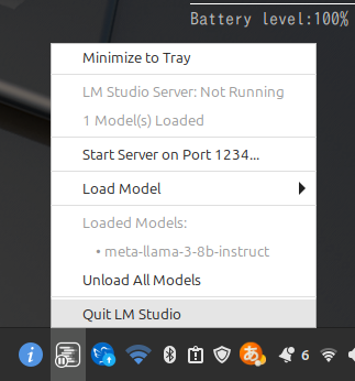 完全に終了するには、パネル内のアイコン(下記画像の左から2番め)を右クリックして、「Quit LM Studio」で完全に終了させることができます。