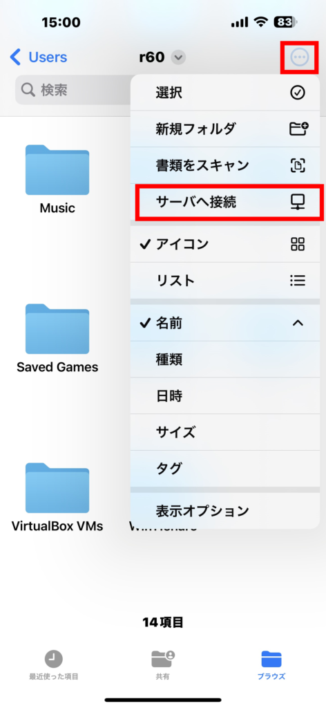 1,画面右上の「・・・」をタップ>「サーバへ接続」をタップ