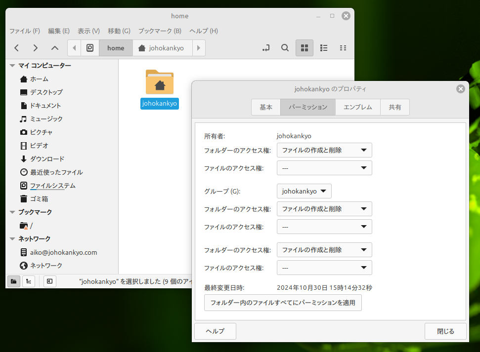 続けて、自分のホームディレクトリ内の、LinuxMint上で公開したいフォルダ上で右クリック>「共有の設定」を開きます。